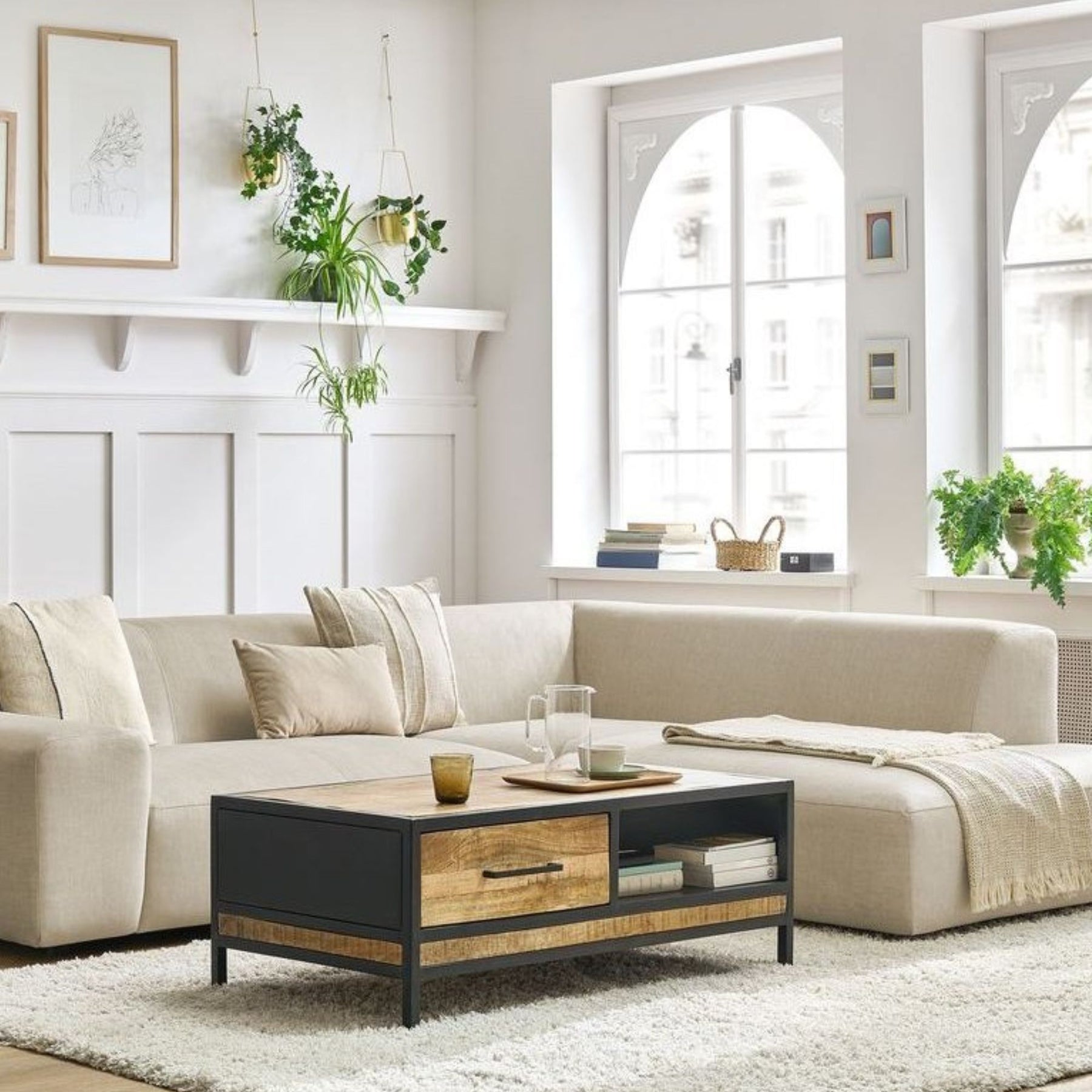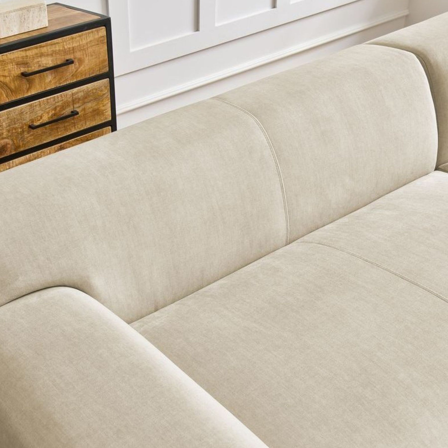 Son revêtement en velours beige apporte une touche élégante et chaleureuse, idéale pour créer une ambiance raffinée et accueillante dans le salon.