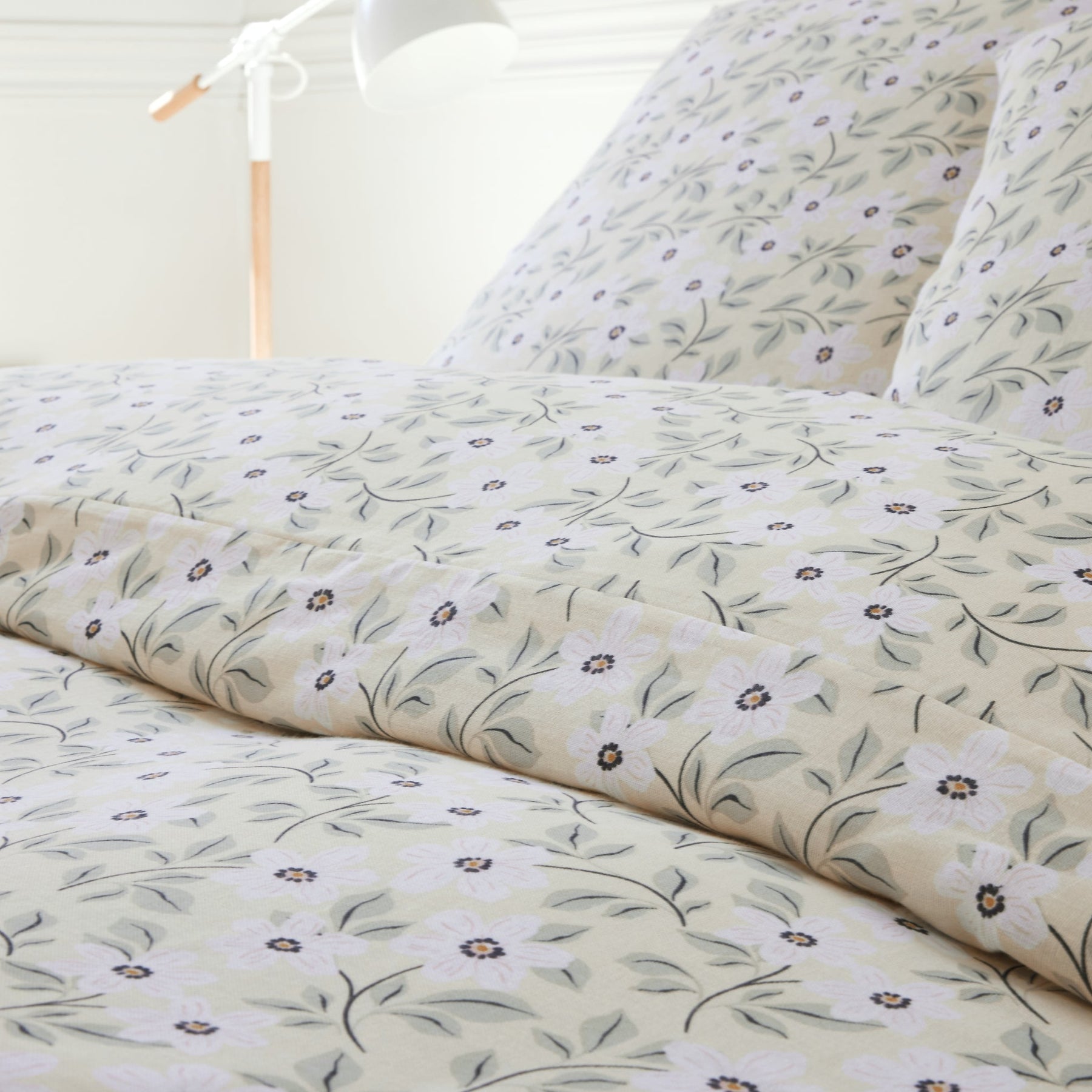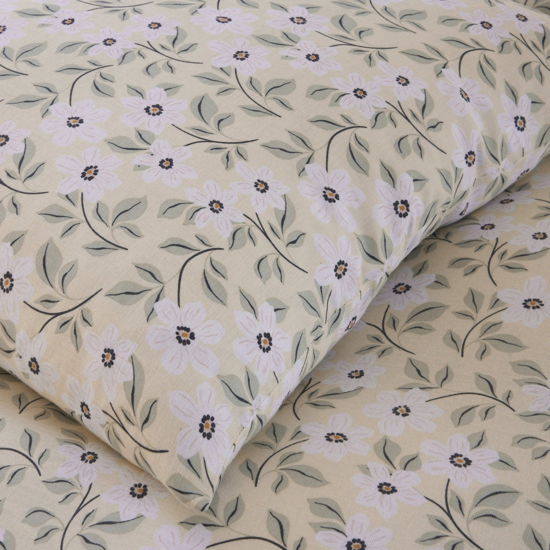 • Couleurs: Fond jaune pâle chaleureux, avec de petites fleurs blanches accompagnées d’un feuillage vert tendre évoquant un jardin printanier
