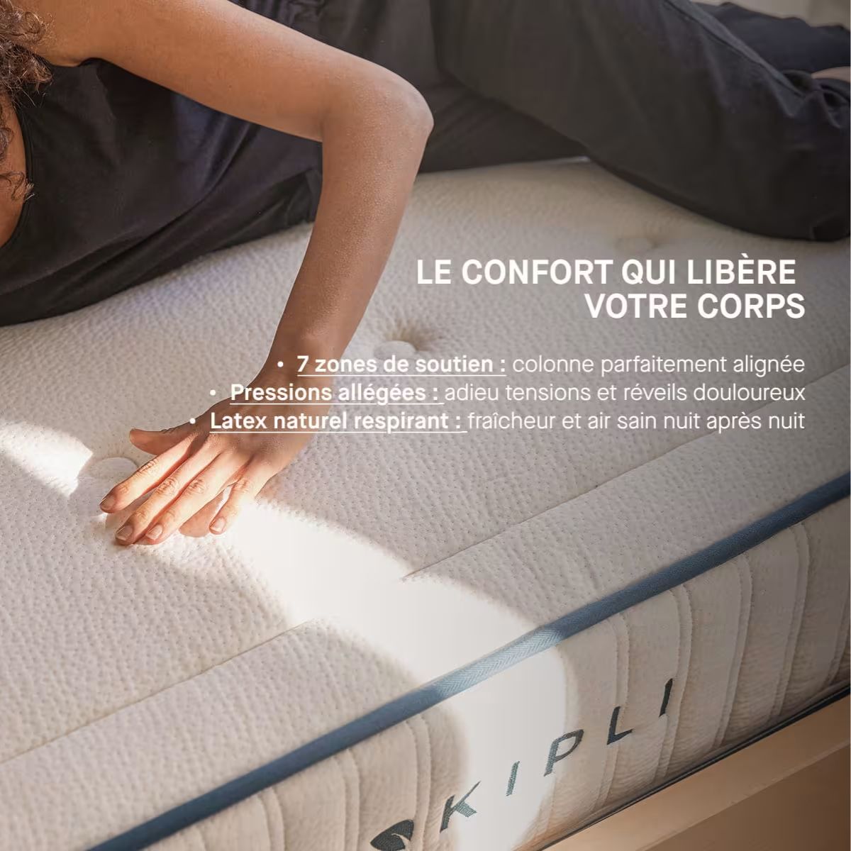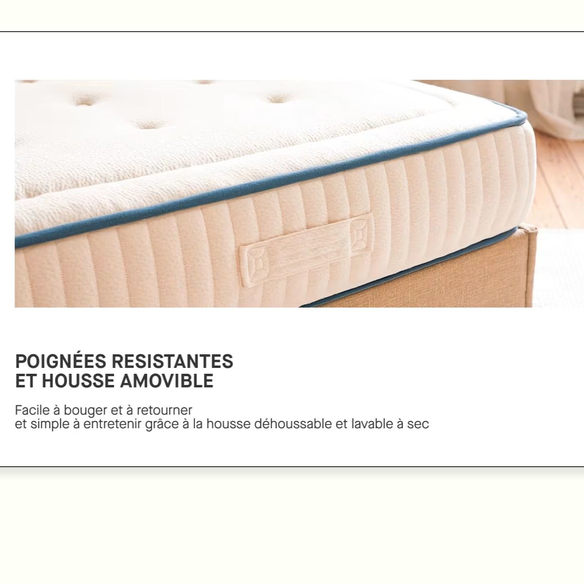 ⚠️ Le matelas doit impérativement être posé sur un sommier (et non directement au sol) afin de garantir une bonne circulation de l’air