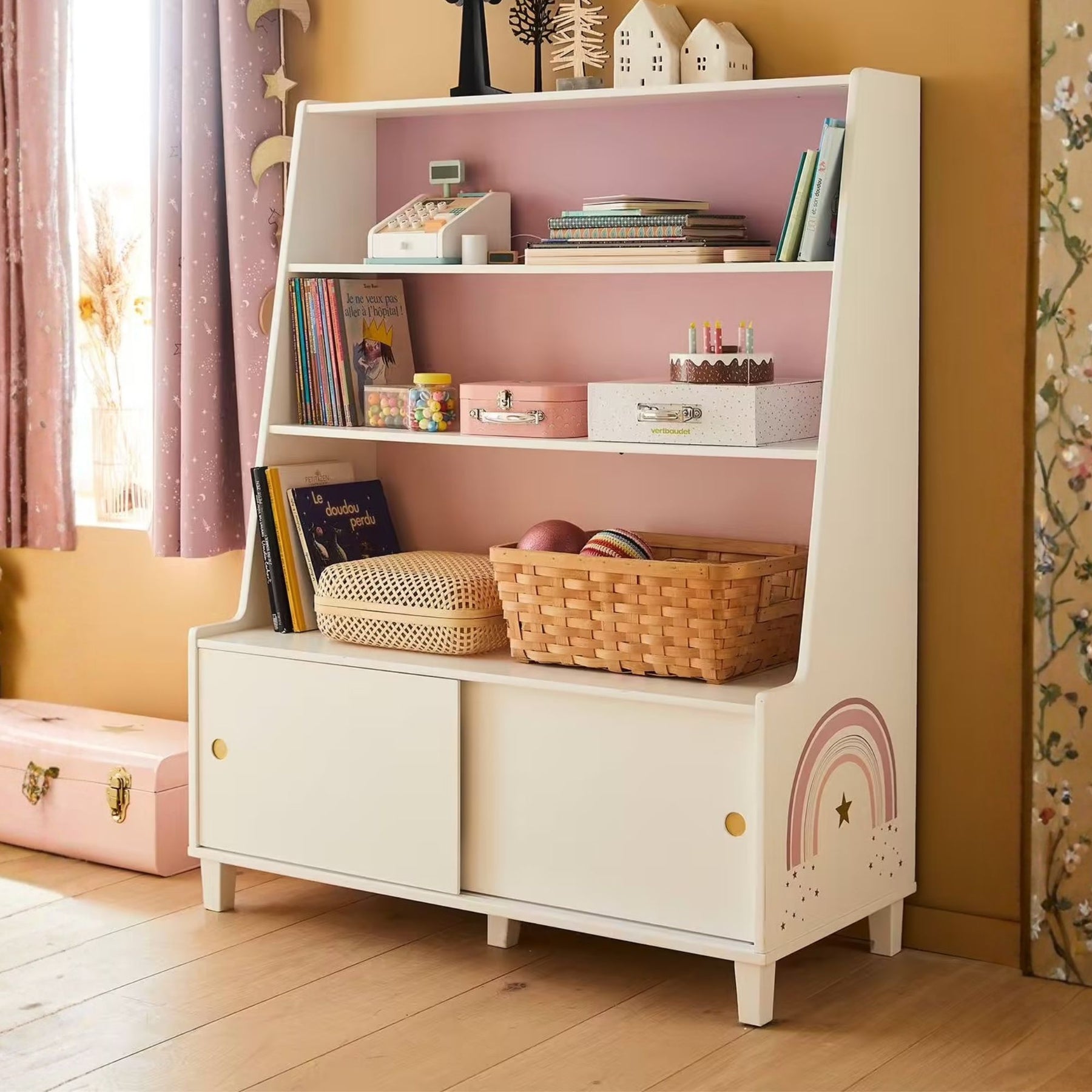 La bibliothèque VERTBAUDET Make a Wish blanc est une solution de rangement à la fois pratique et décorative pour une chambre d’enfant ou un espace de jeux. Pensée pour exposer livres, jouets ou objets déco, elle combine espaces ouverts et compartiment fermé avec portes coulissantes pour organiser tout en conservant un look doux et épuré. Les motifs sérigraphiés façon arc-en-ciel ajoutent une touche joyeuse à l’ensemble, idéale dans une chambre enfant.