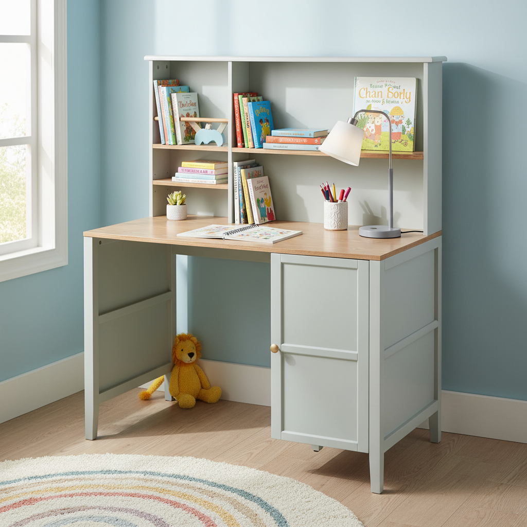 ☁️ Multiples rangements (placard, étagères, compartiments) pour organiser fournitures, cahiers et crayons