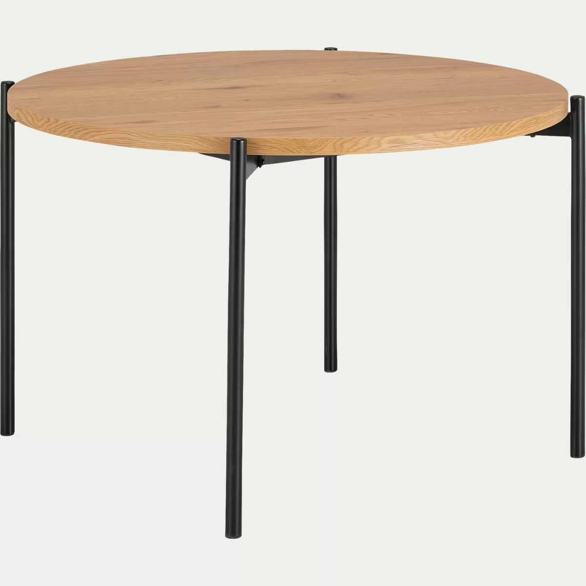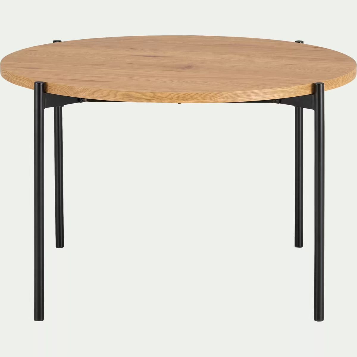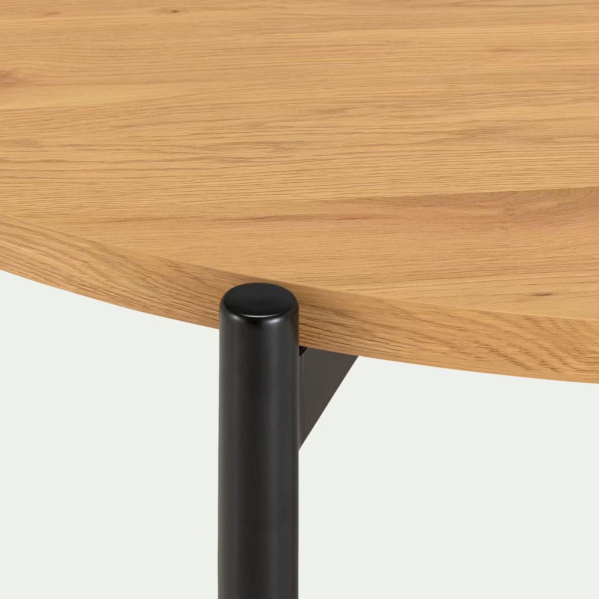 Apportez douceur, convivialité et style à votre salle à manger avec cette table ronde en bois imitation chêne. Sa silhouette circulaire favorise les échanges et crée une ambiance chaleureuse, idéale pour partager des repas ou profiter de moments simples du quotidien. Son plateau de 120 cm, délicatement posé sur un piétement en acier noir mat, allie élégance naturelle et caractère contemporain.