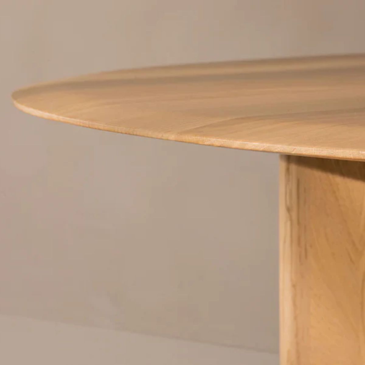 Son plateau rond en bois de chêne massif, aux bords lisses et soigneusement travaillés, offre une esthétique minimaliste tout en mettant en valeur le veinage naturel du bois. Les pieds robustes en chêne assurent une excellente stabilité et renforcent le caractère authentique de l’ensemble.