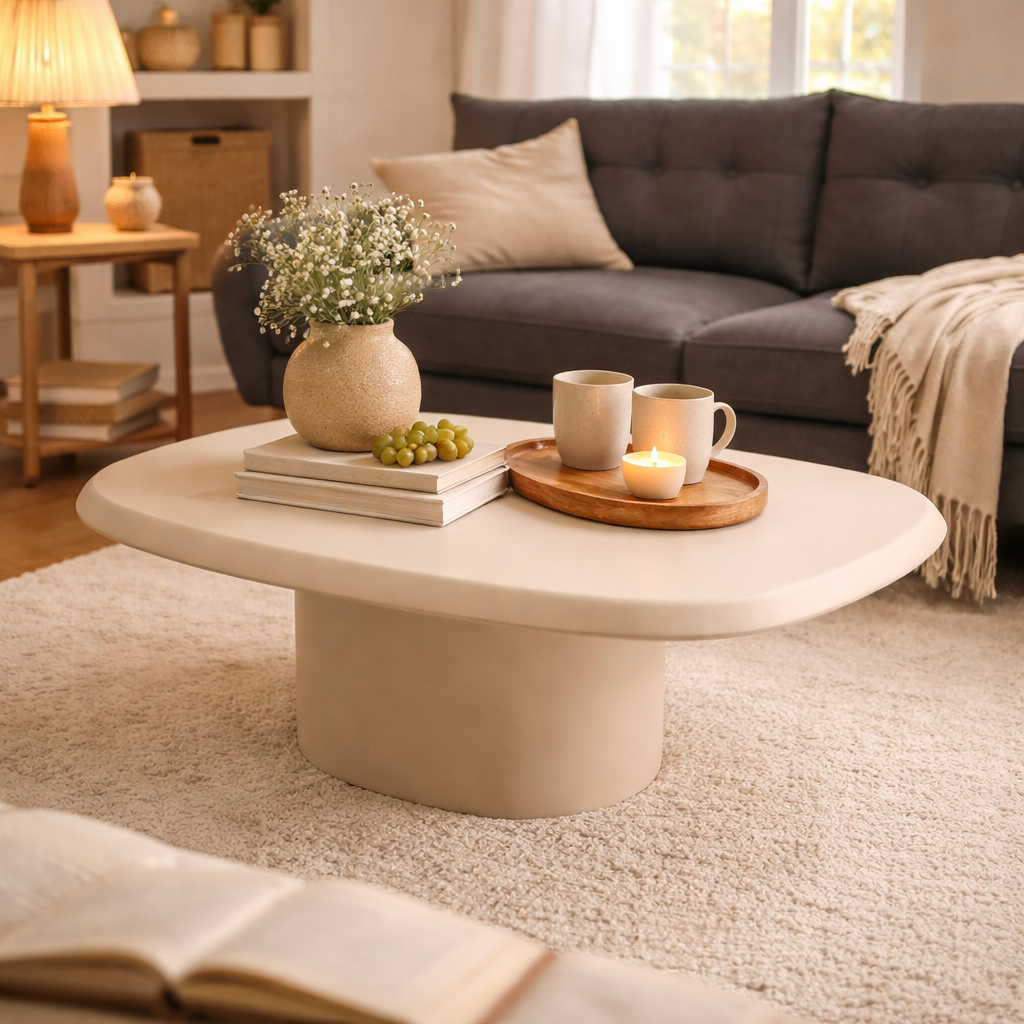 Design organique et contemporain qui structure le salon avec douceur