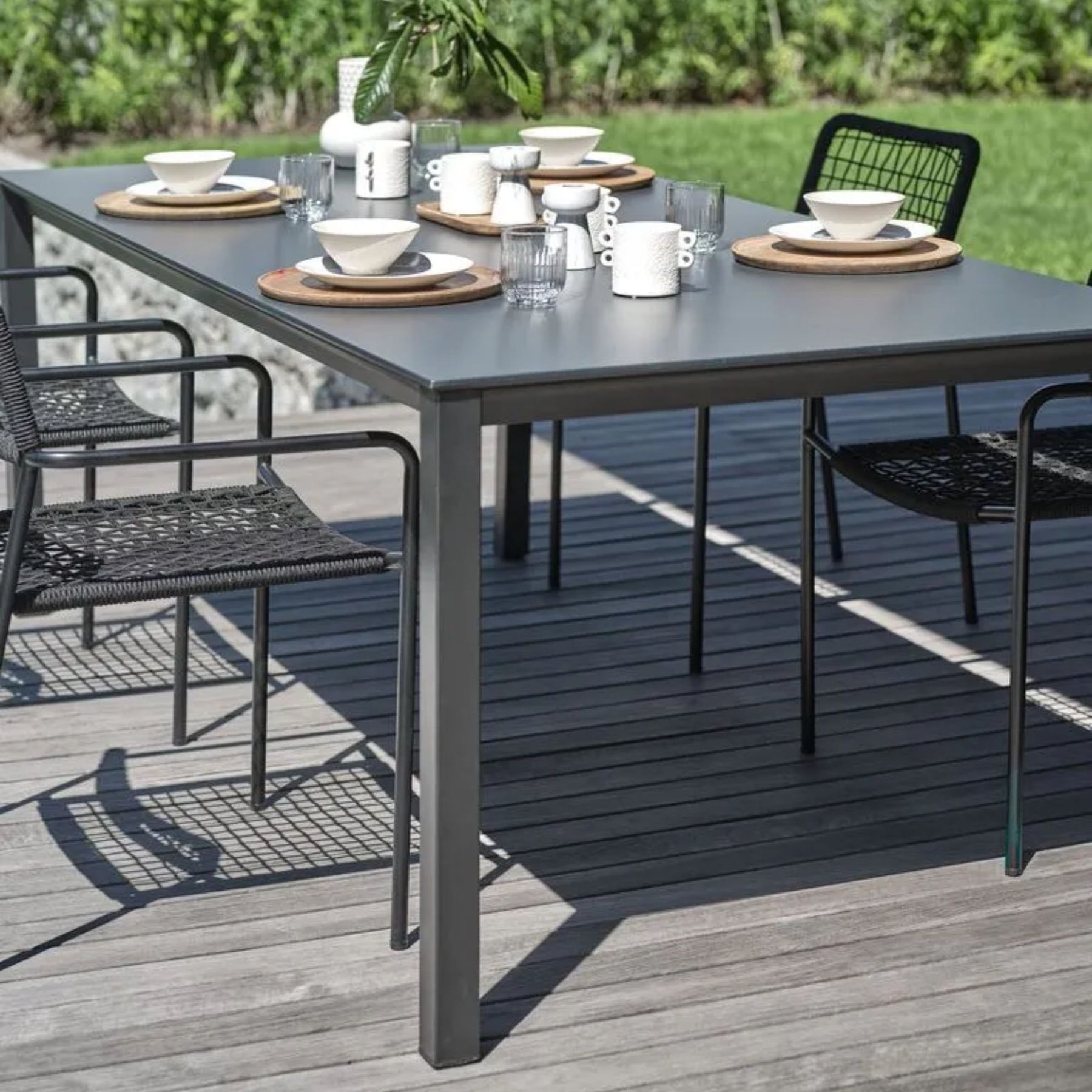 Sa structure et ses pieds en aluminium peint par poudrage assurent légèreté, robustesse et durabilité. Insensible à la rouille, l’aluminium en fait une table parfaitement adaptée à un usage extérieur prolongé. Grâce à ses dimensions généreuses, la table Langet permet d’accueillir confortablement famille et invités pour partager des repas conviviaux en plein air.