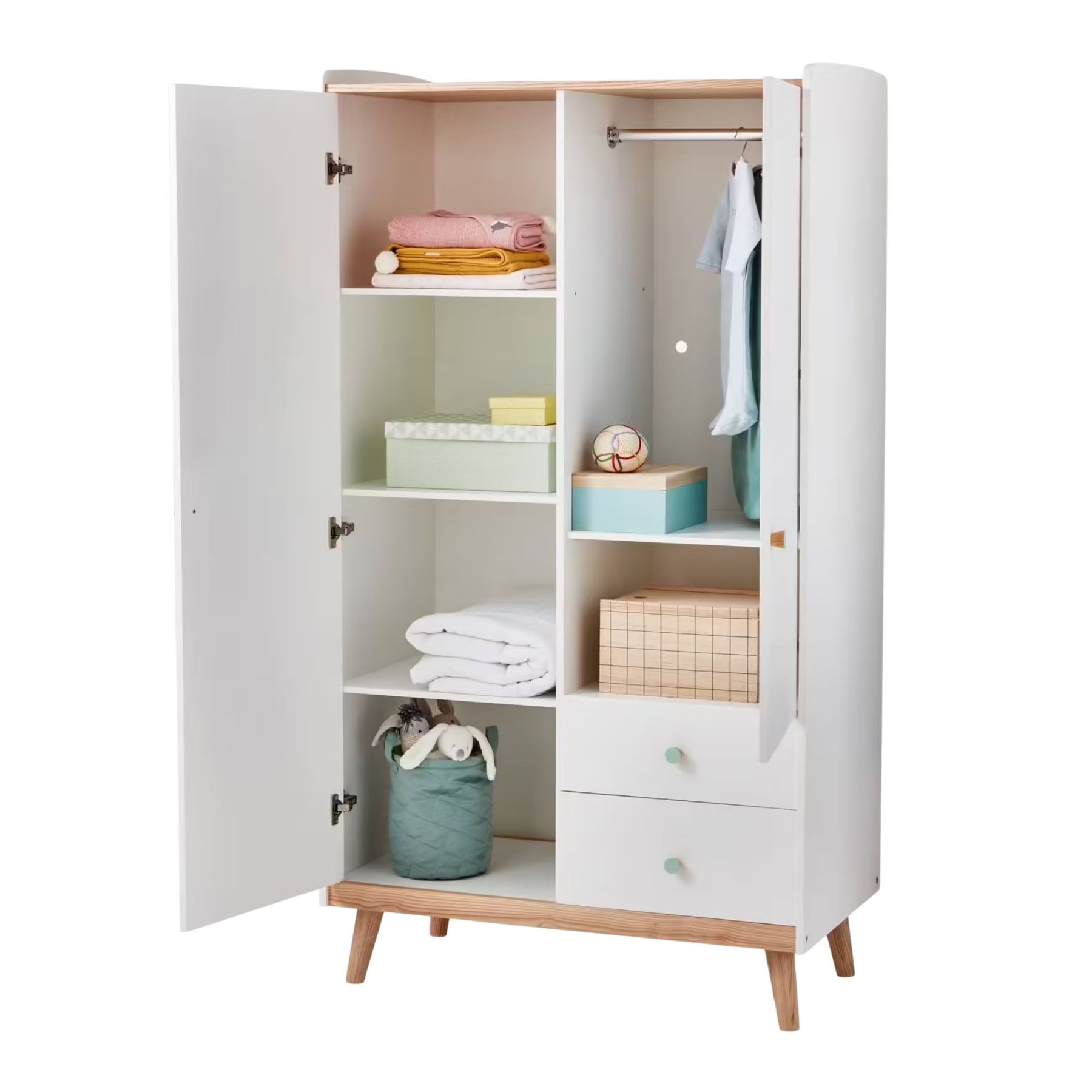 L’armoire 2 portes VERTBAUDET Confetti blanc est une solution de rangement complète et très fonctionnelle pour organiser efficacement la chambre de votre enfant. Avec son volume généreux et ses multiples espaces de rangement — penderie, étagères et tiroirs — elle se transforme en petit dressing parfait pour trier vêtements, jouets ou linge. Son design épuré s’intègre facilement dans tous les styles d’intérieur tout en proposant une personnalisation des poignées pour une touche ludique.