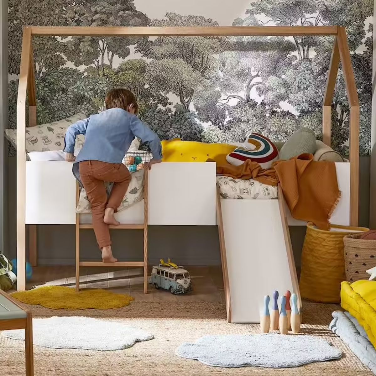 ☁️ Lit maisonnette + toboggan amovible pour jouer dès le saut du lit