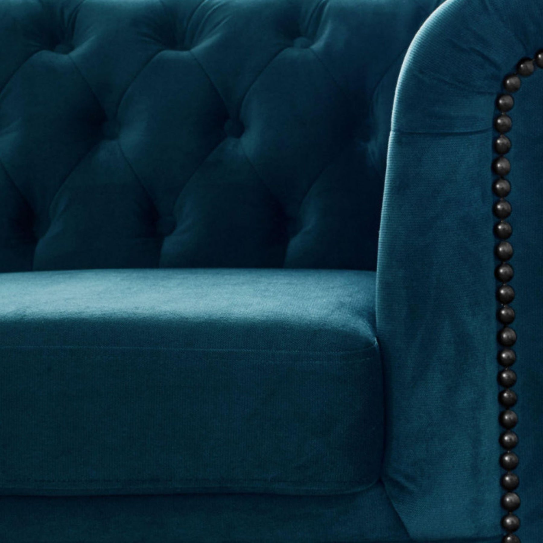 Détails : Capitonnage sur dossier et assise, clous noirs décoratifs