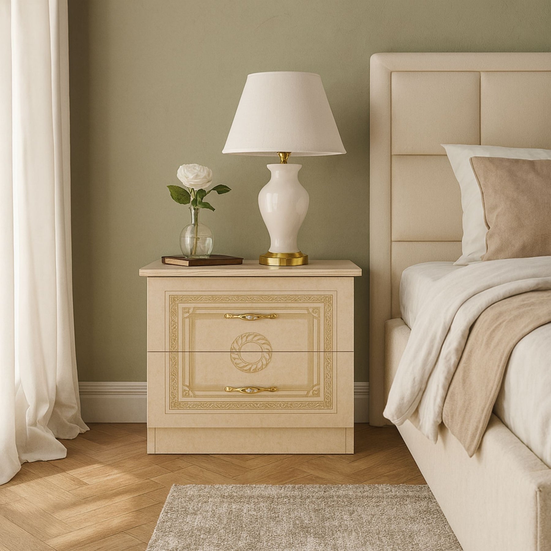 Apportez une touche d’élégance intemporelle à votre chambre avec les tables de chevet Soraya signées Les Tendances. Issues d’une fabrication italienne haut de gamme, elles incarnent le raffinement baroque dans toute sa splendeur. Leur finition laquée beige et leurs détails dorés délicatement sérigraphiés en font de véritables pièces décoratives, tout en offrant une grande fonctionnalité.