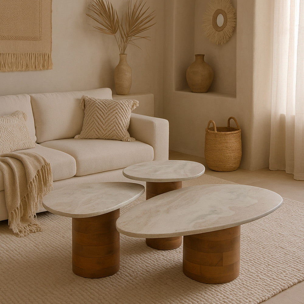 Le contraste du marbre raffiné et du bois brut apporte profondeur et caractère à votre intérieur. Ensemble ou séparées, les tables Suki insufflent une ambiance bohème chic et un charme indéniablement exotique.
