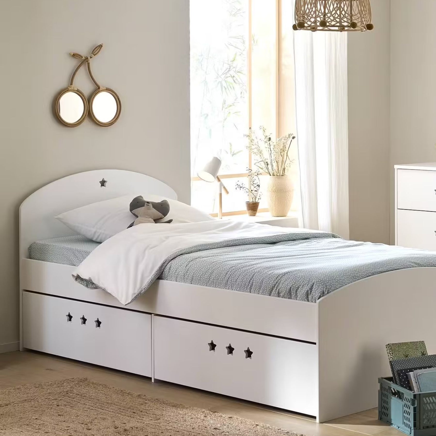 Le lit fixe enfant VERTBAUDET Sirius blanc combine couchage confortable et rangement malin dans un même meuble. Pensé pour optimiser l’espace de la chambre, ce lit allie un design simple et épuré à une solution pratique avec deux tiroirs intégrés sous le couchage, parfaits pour y glisser linge de lit, jouets ou vêtements. La ligne Sirius, identifiable par ses découpes en forme d’étoile, apporte une touche douce et ludique à l’ambiance de la chambre.