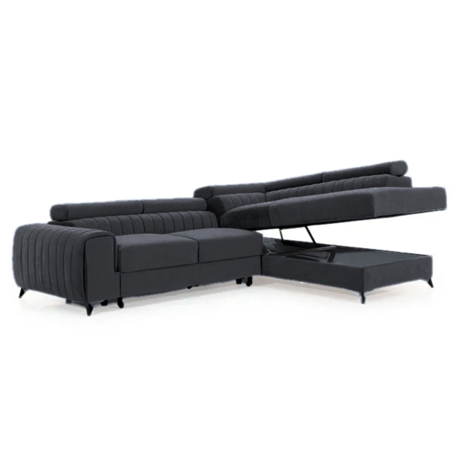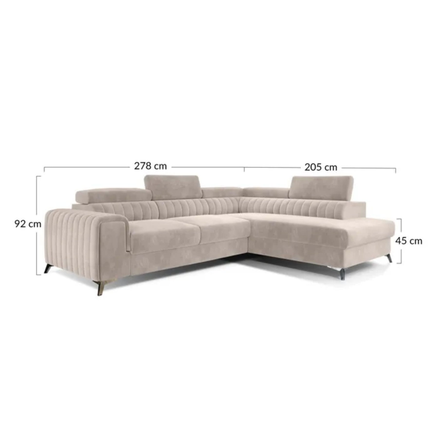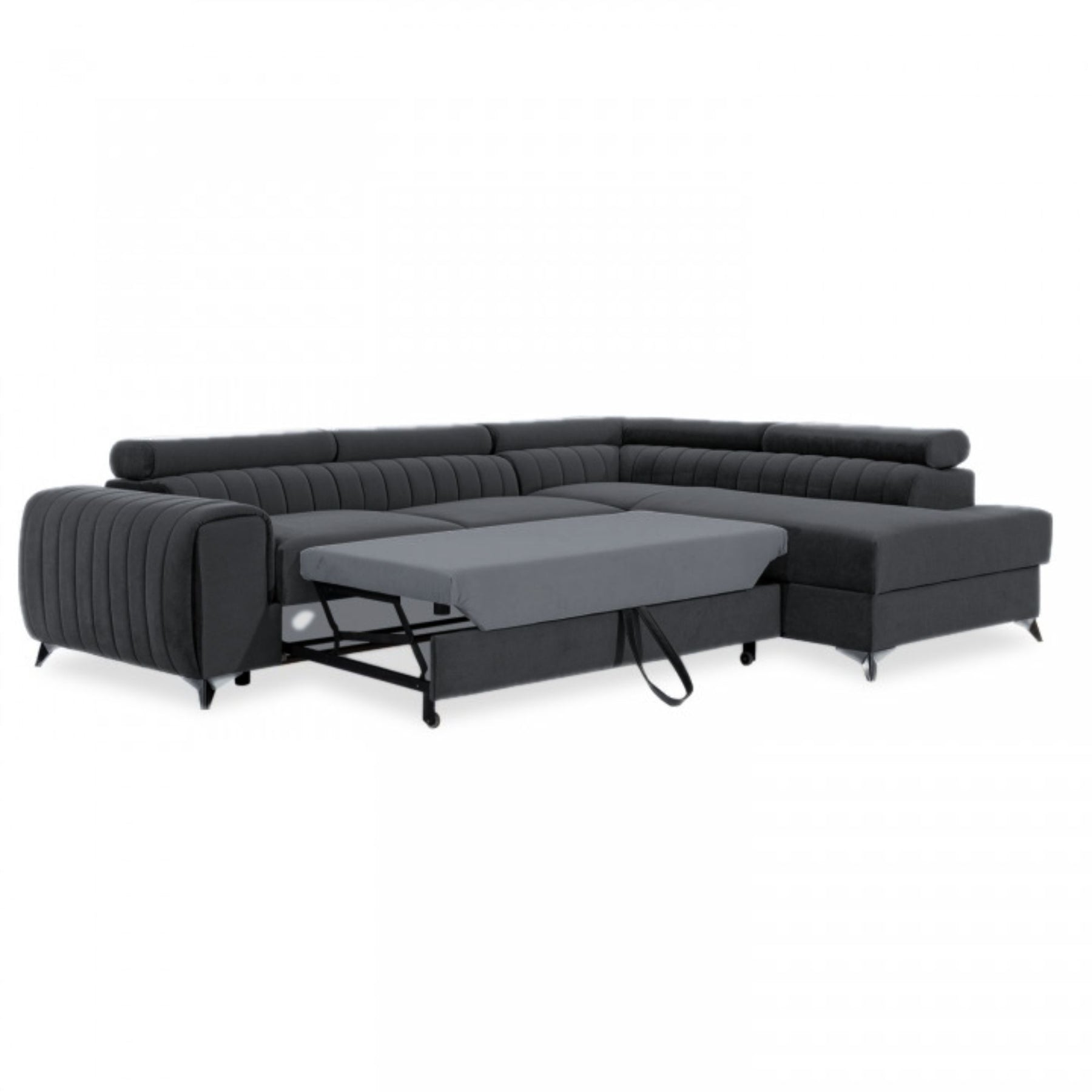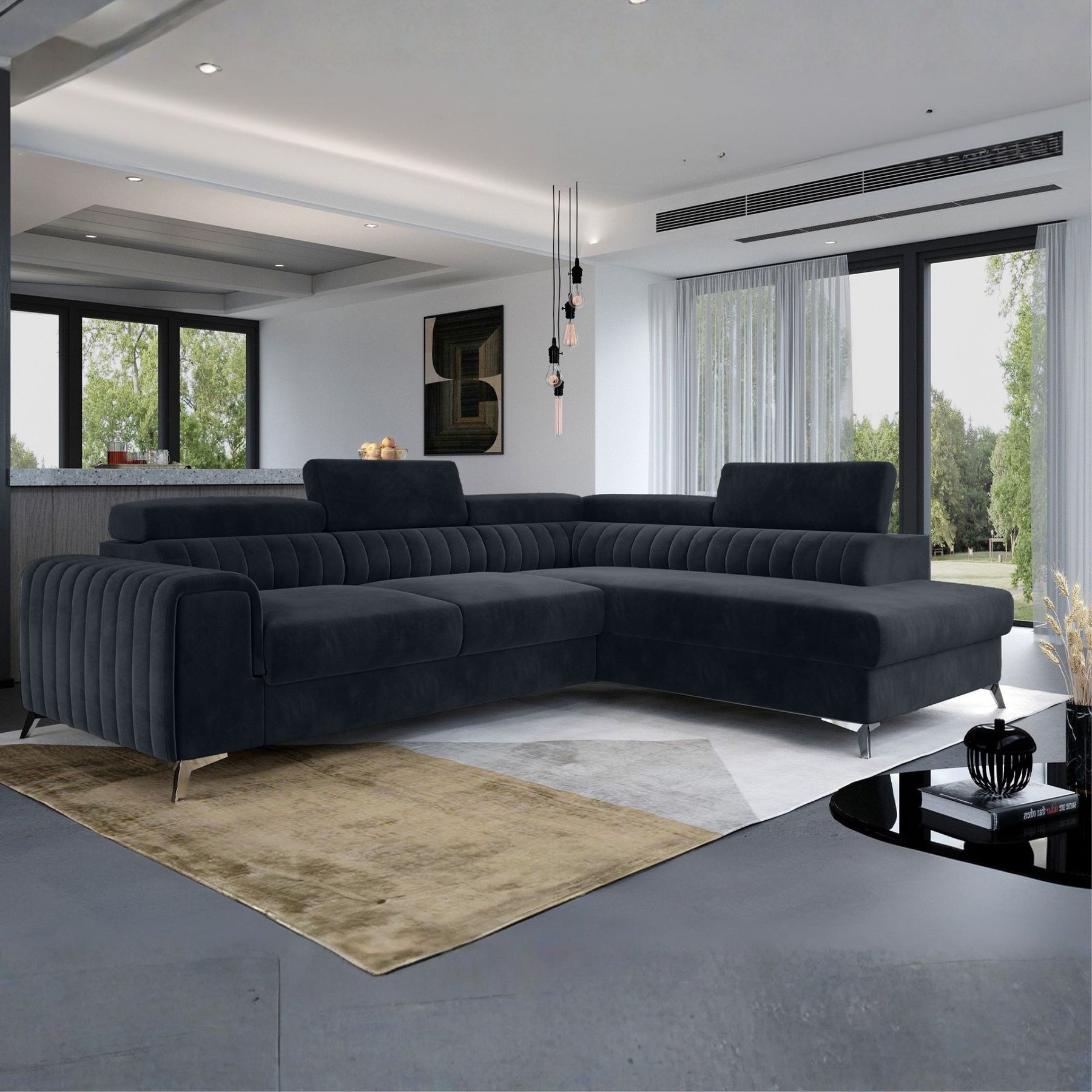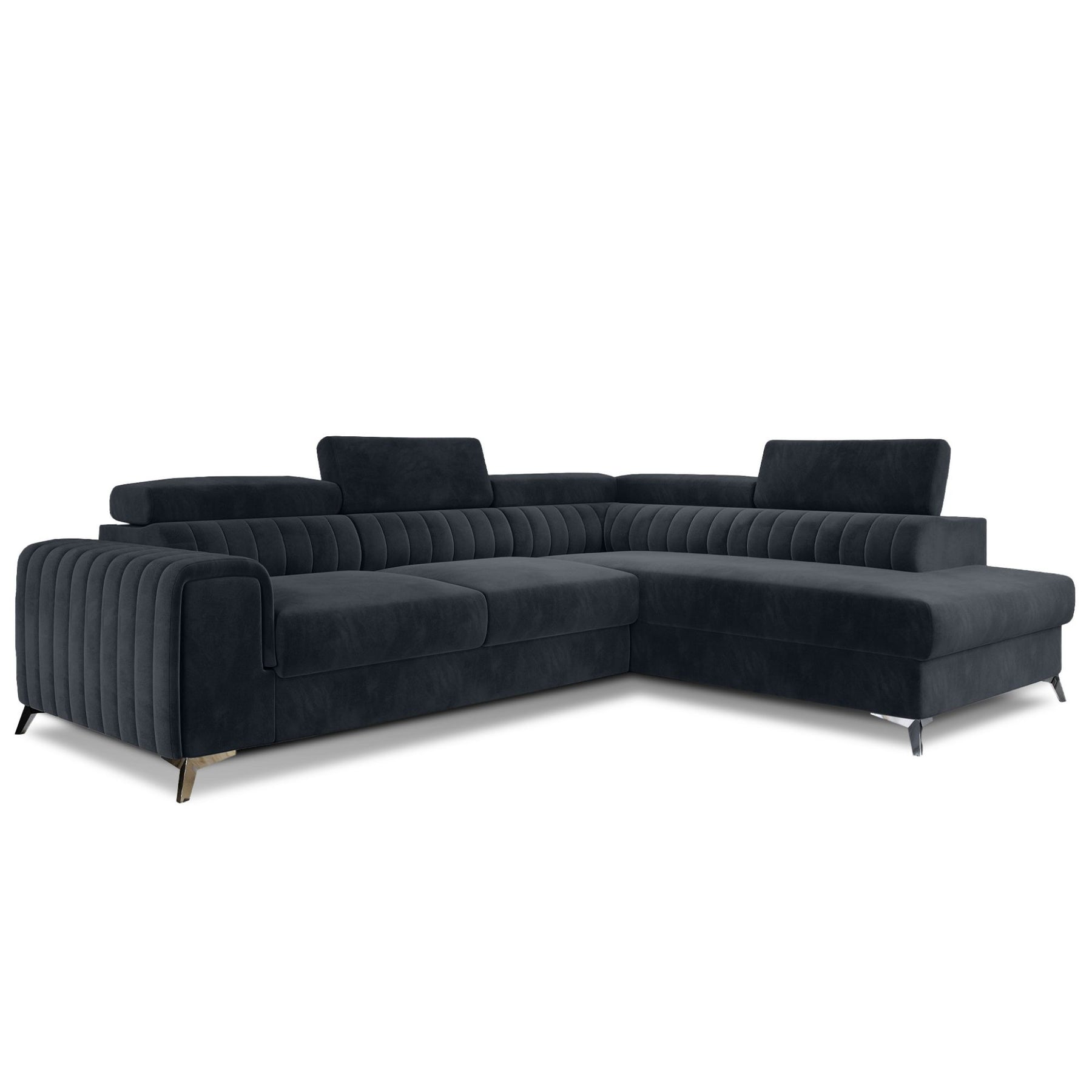 Canapé convertible d'angle droit LES TENDANCES Loza 5 places en velours gris avec appui-têtes réglables, coffre et pieds acier chromé