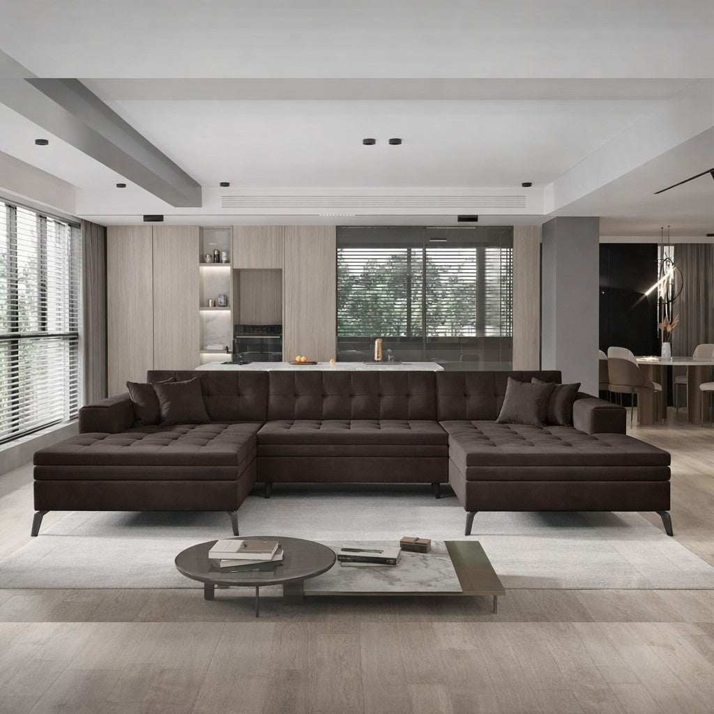 Le canapé panoramique ROMY combine avec brio élégance, confort et fonctionnalité. Son revêtement en velours doux et lumineux, associé à sa structure aérienne sur pieds métalliques noirs, en fait la pièce maîtresse d’un salon contemporain. À la fois spacieux et convertible, il offre une solution complète pour accueillir, se détendre ou dormir dans un confort absolu.