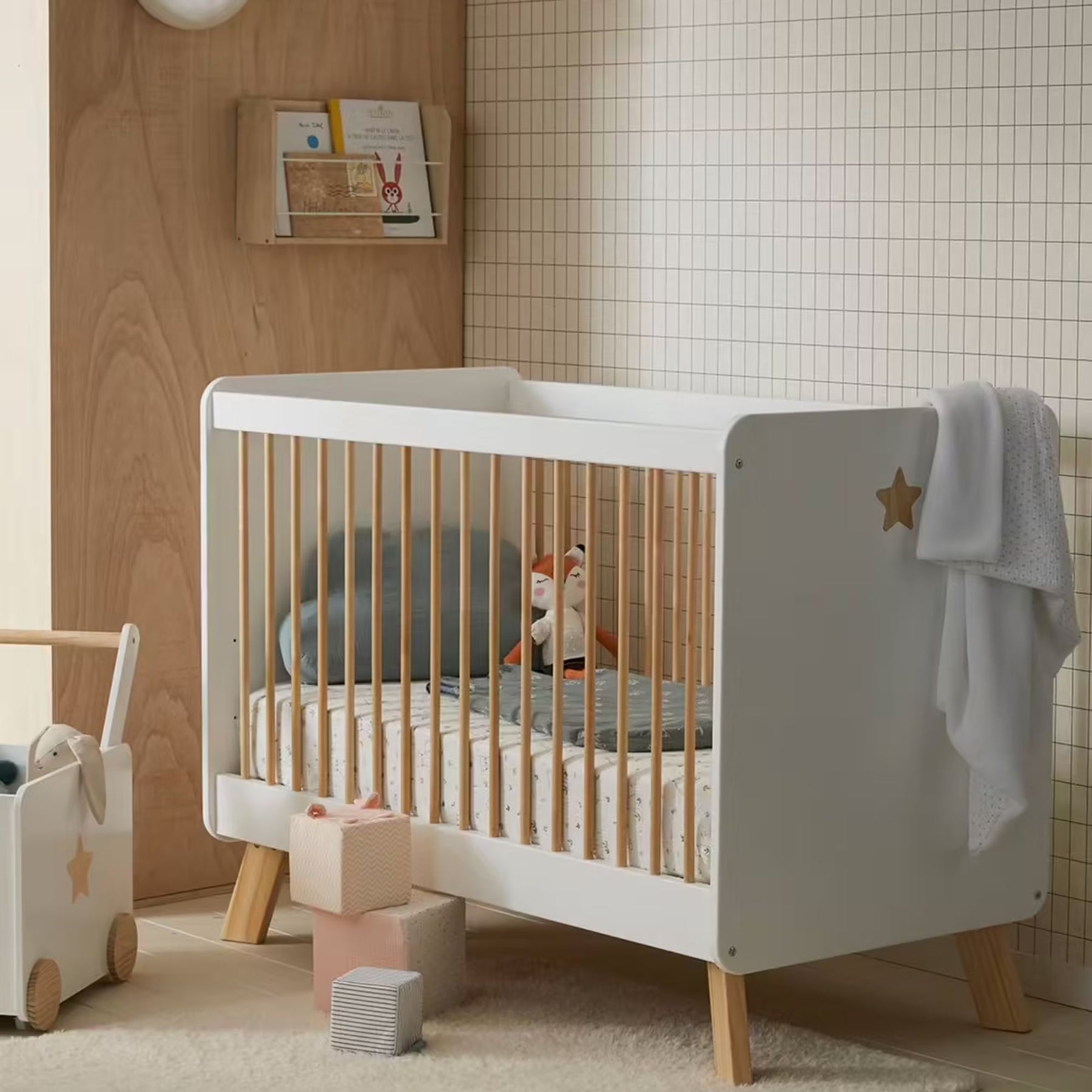 Le lit bébé VERTBAUDET Grande Ourse blanc/bois allie design poétique et confort sécurisé pour accompagner les premiers mois de votre enfant. Avec son joli jeu de contraste entre le bois naturel et le blanc mat, il crée une atmosphère douce et chaleureuse dans la chambre de bébé. Sa conception robuste et son sommier réglable en hauteur facilitent le quotidien des parents tout en offrant à votre tout-petit un espace de sommeil rassurant et bien ventilé.