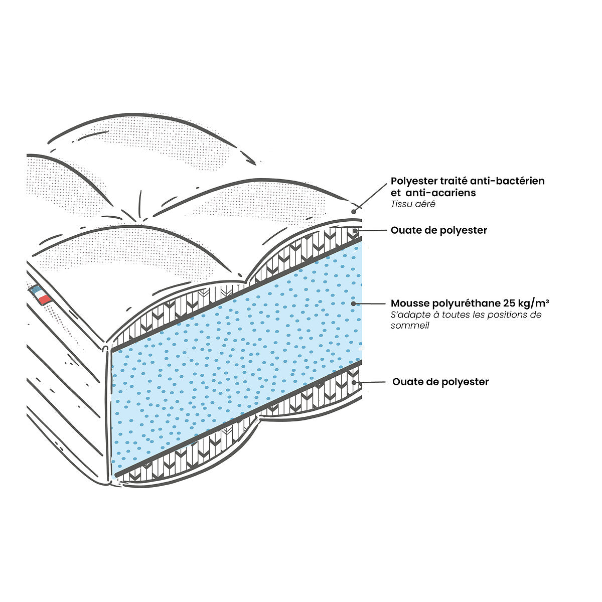 Doté d’un accueil moelleux associé à une fermeté ferme, ce matelas garantit un bon maintien du corps tout en procurant une sensation de confort dès les premières nuits. Sa conception en mousse polyuréthane en fait un matelas léger, facile à manipuler, avec un excellent rapport qualité/prix.