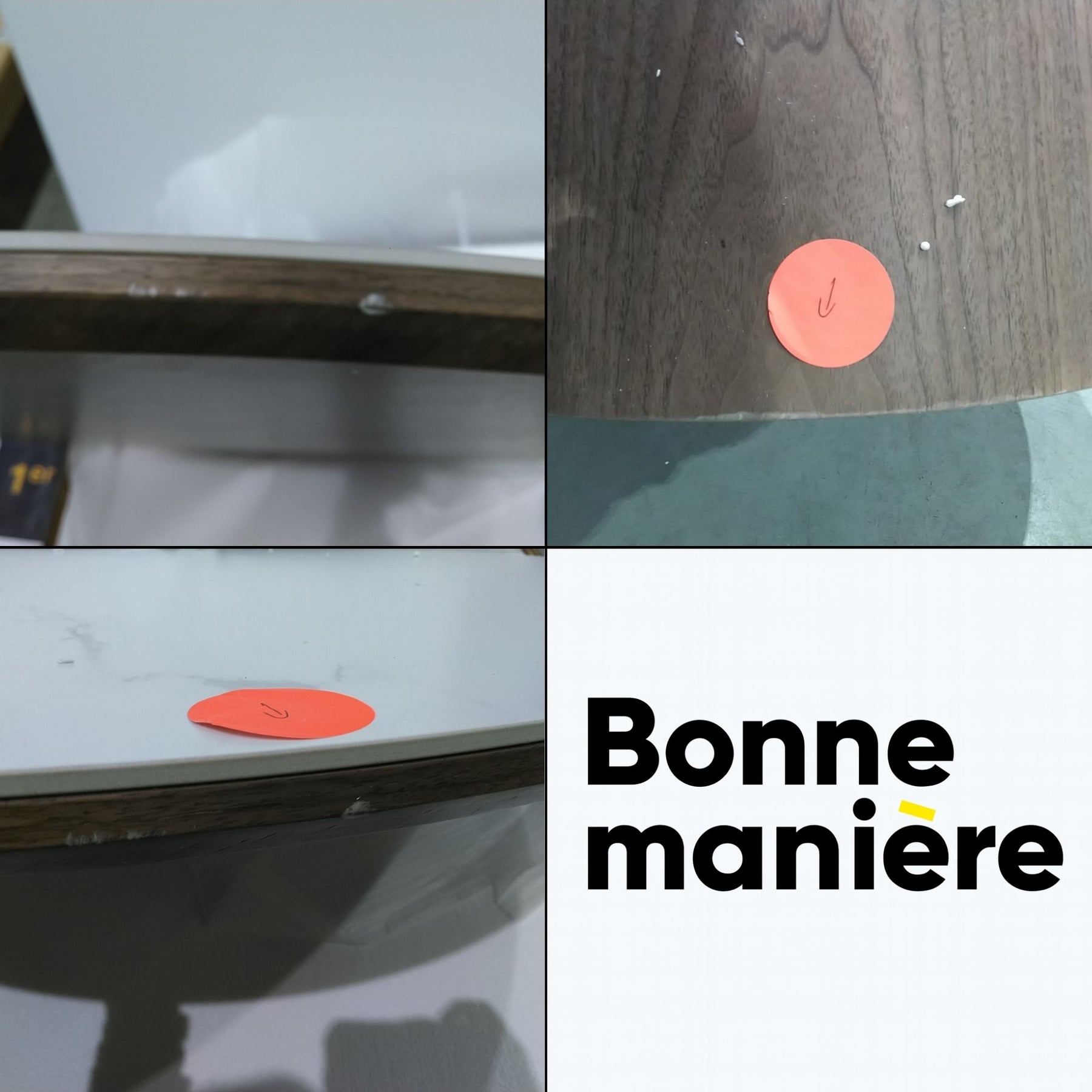 Défaut : traces de frottement sur le bas du pied et sur la tranche du plateau (voir photos)